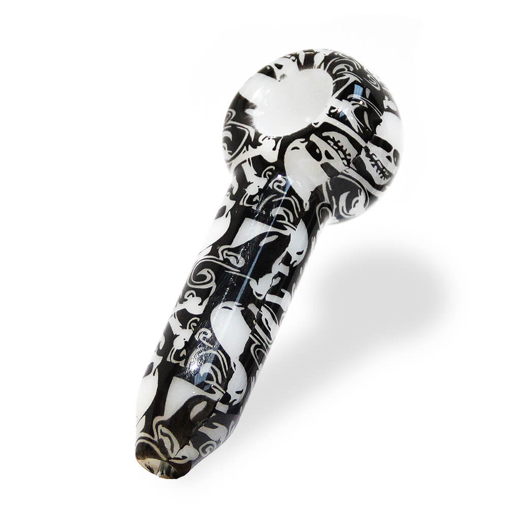 This wholesale Black Skulls Ghost Glass Pipe is beautifully designed, wears delightful skulls imprint in black color on white background, has a generous bowl for even your most demanding customer, and is as functional as it is expressive.