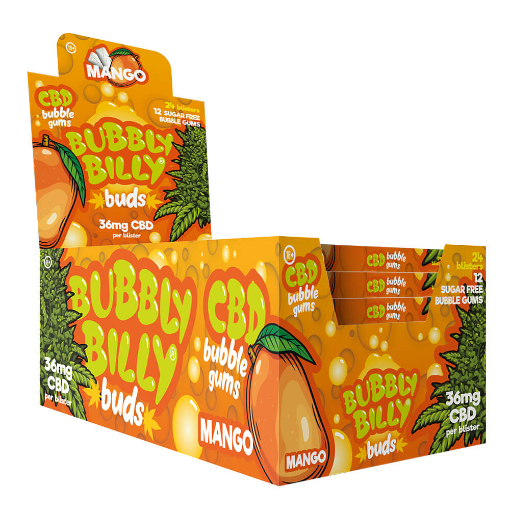 Our Wholesale Bubbly Billy Cannabis Chewing Gums 36mg CBD Mango flavored cannabis chewing gum has 36mg of CBD, and is wrapped in a 24-pack display.