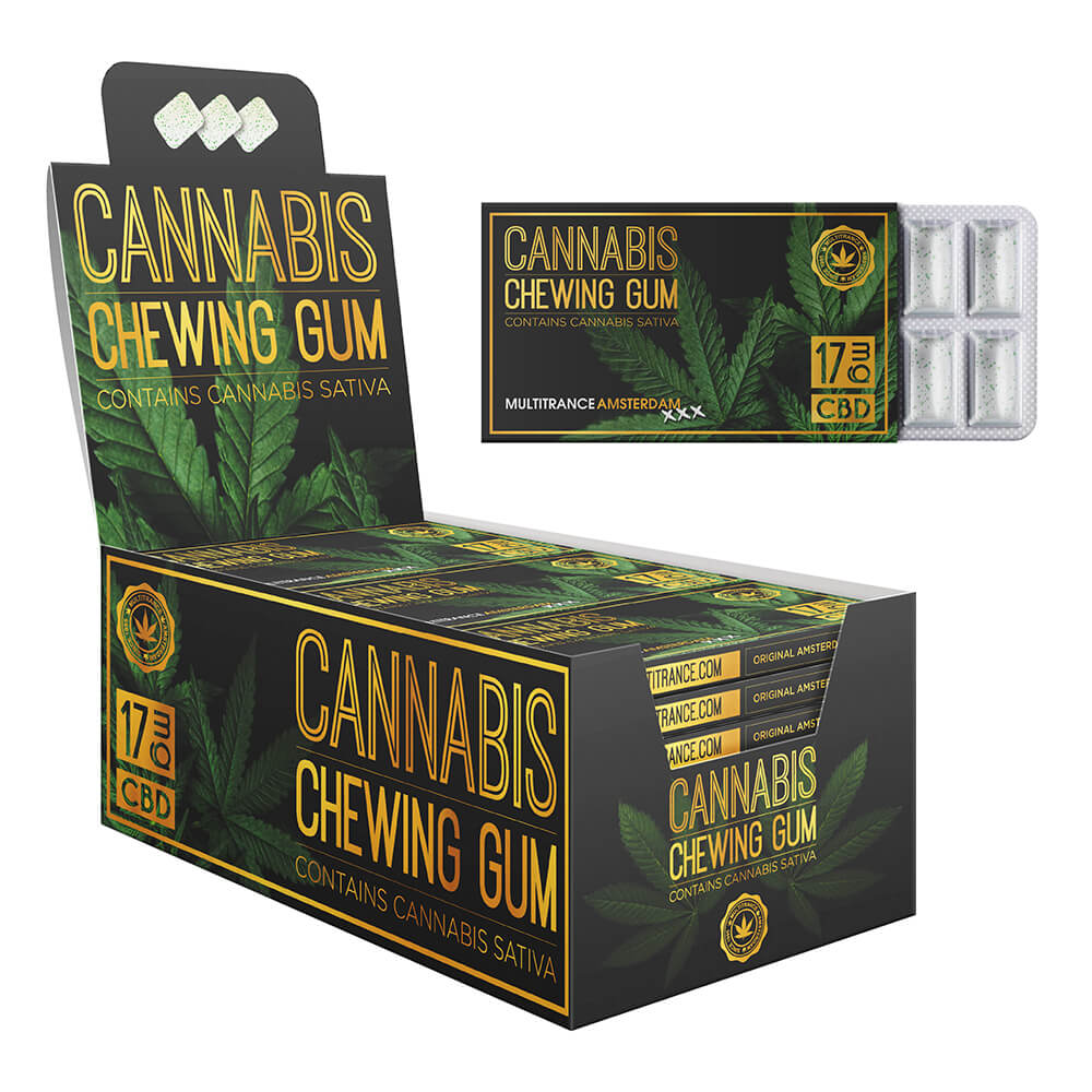 Sweeteners: sorbitol, isomalt, maltitol syrup, acesulfame k, sucralose; gum base (contain soy lecithin), flavours; humectant: glycerol; thickening agent: gum arabic; hemp essential oil (0,3%); CBD oil; colours: E171, E141ii, glazing agent: carnauba wax; antioxidant: E321.