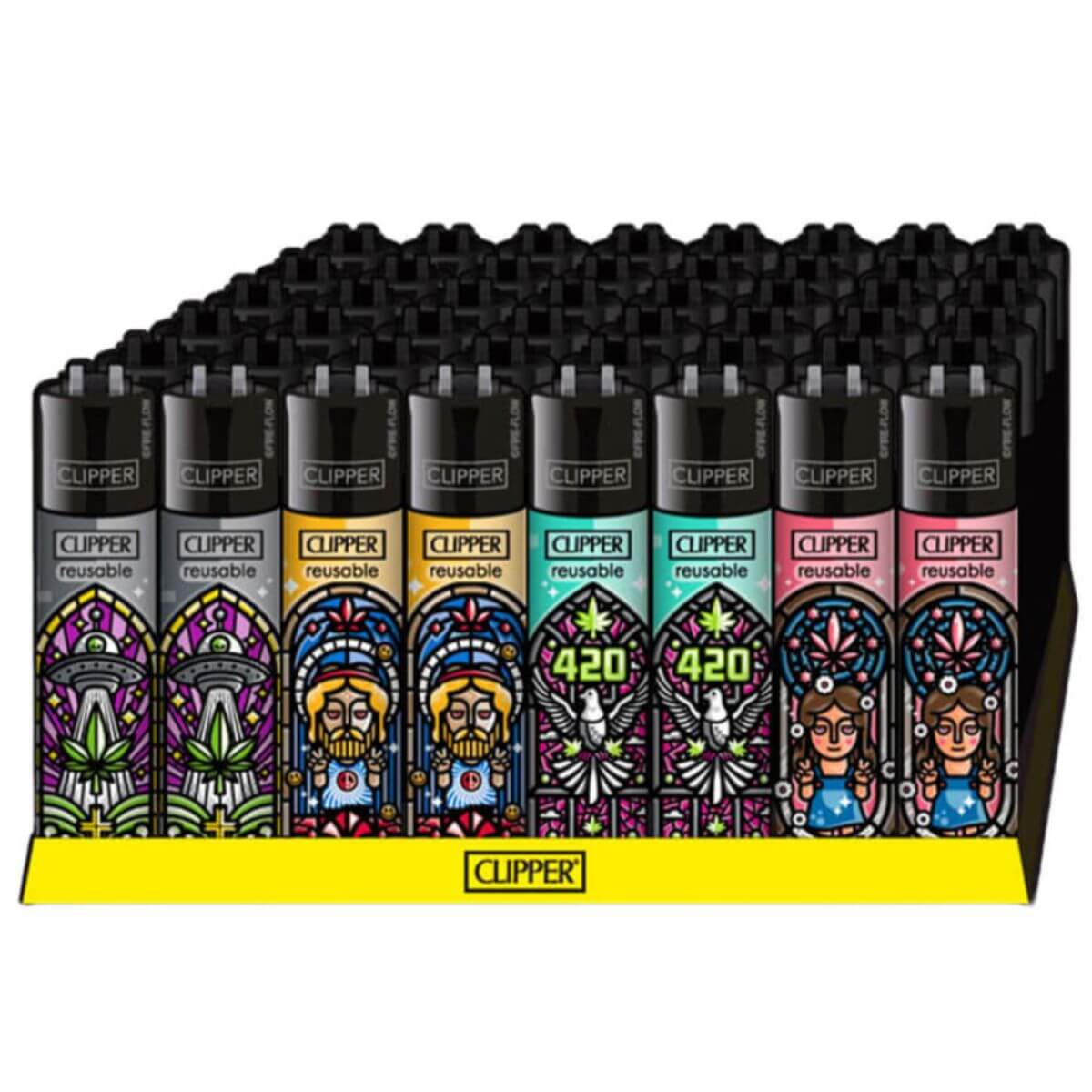 The Clipper Lighters Classic Church Windows (48pcs/display) collection showcases intricate stained-glass-inspired artwork on Clipper’s trusted refillable lighters. Each piece features vibrant geometric patterns reminiscent of cathedral windows, combining artistry with practical functionality. Packaged in a 48-piece display tray, this series is ideal for smoke shops, gift stores, and lifestyle retailers seeking visually striking, collectible, and eco-friendly products.