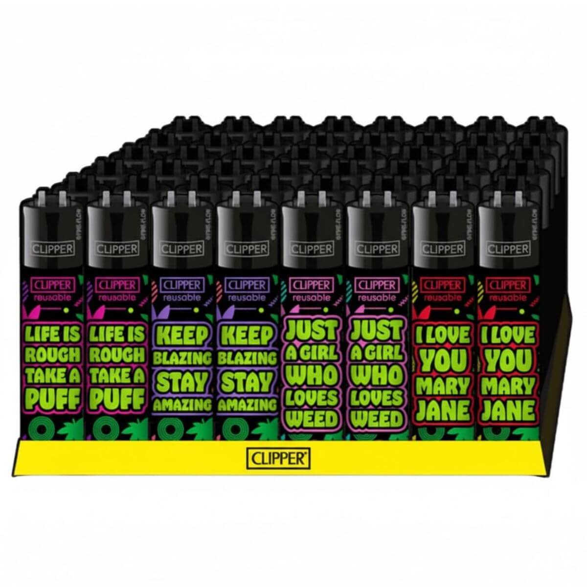 The Clipper Lighters Classic Weed Statements #8 (48pcs/display) collection combines bold cannabis-inspired slogans with Clipper’s trusted refillable lighter technology. Each lighter features vibrant colours and modern typography, perfect for lifestyle consumers, collectors, and smoke shop customers. Built with a durable nylon body, refillable gas system, and replaceable flint, these lighters are long-lasting, eco-friendly, and ideal for retail display. The 48-piece tray ensures easy merchandising and strong visual impact for impulse sales.