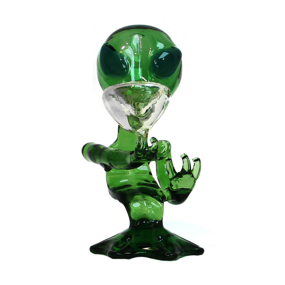 An alien-themed bong, the Green Alien Glass Bong 15cm is cool, sturdy, durable, and stylish with a unique design.