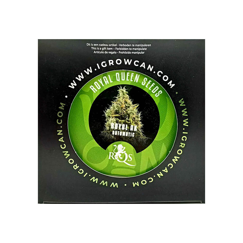 The Royal Queen Seeds Royal AK IGrowCan is a compact kit designed to present the Royal AK autoflowering strain together with essential supporting materials in one organized package. The kit contains two autoflowering seeds, a germination plug, 1.7 liters of coco substrate, organic nutrients, and a detailed manual. All components are assembled inside a tin container that also functions as a pot and includes a tray intended to collect excess water, keeping the entire set neatly contained for convenient handling and storage.