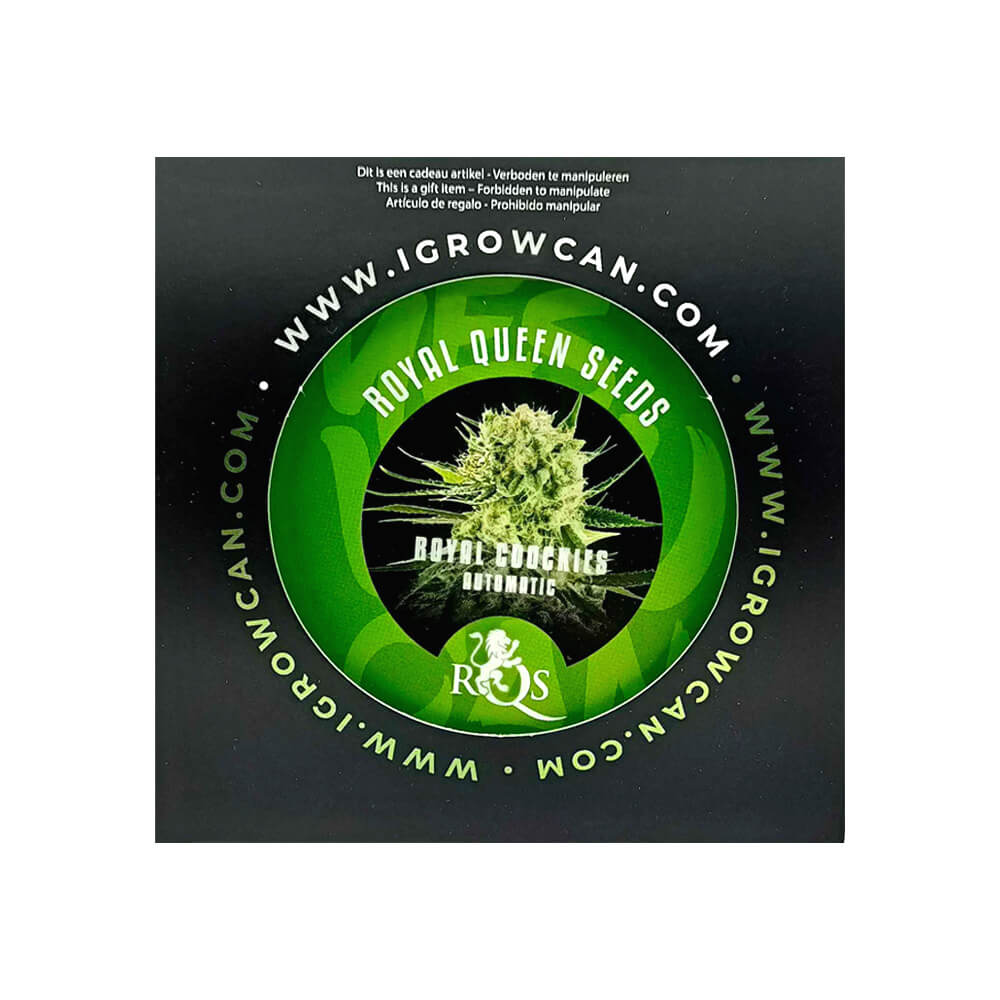 The Royal Queen Seeds Royal Cookies IGrowCan is a compact kit that presents the Royal Cookies Auto strain together with essential accompanying materials in a single package. The strain is known for its characteristic dessert-like profile, featuring a biscuit-style aroma with a subtle minty note. Inside the IGrowCan, users will find two autoflowering seeds, a germination plug, coco substrate measuring 1.7 liters, organic nutrients, and an informational manual. Each item is arranged to provide a complete set of components for handling and organizing the seeds and substrate.